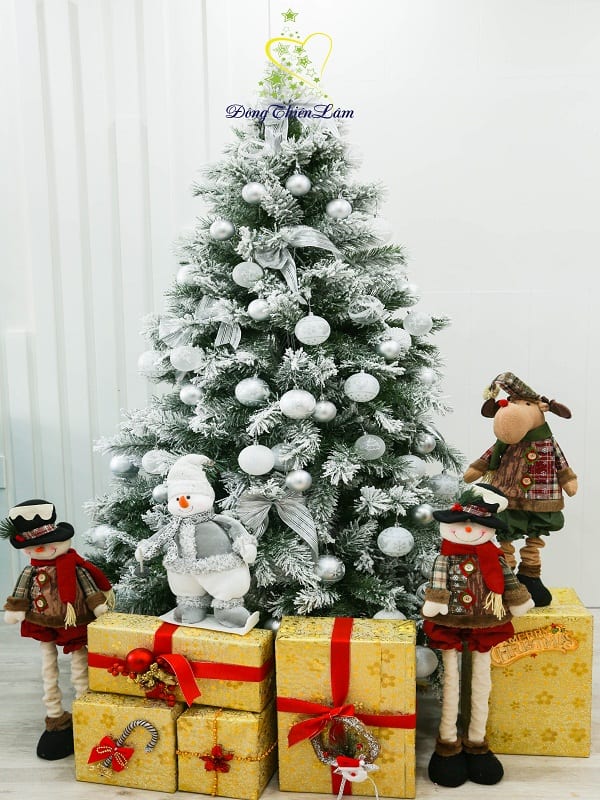 Mẫu cây thông phủ tuyết A4 kết hợp trang trí với trái châu nơ màu bạc ngoại nhập làm cho cây thông trở nên sang trọng và đẹp mắt